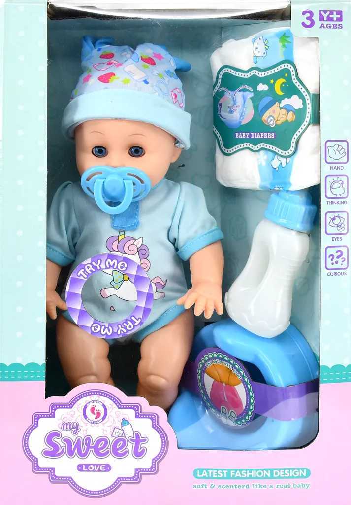 Moja knjižara lutka beba a za uzrast 3+ uz nju ide pelena, flašica i noša. Dimenzije lutke su 27cm X 13cm